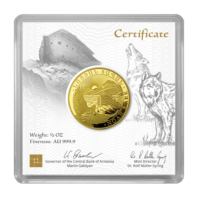 Die Edelmetallmünzen Arche Noah werden von der Zentralbank der Republik Armenien herausgegeben. Als gesetzliche Zahlungsmittel in Armenien unterliegt die Herstellung den strengen Auflagen der Zentralbank: Reinheit des Edelmetalls, Gewicht und Qualität der Prägung werden staatlich geprüft und garantiert. Die Gold-Anlagemünze wird aus reinstem Gold (999,9/1000) hergestellt.