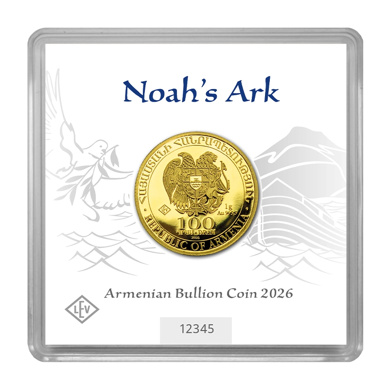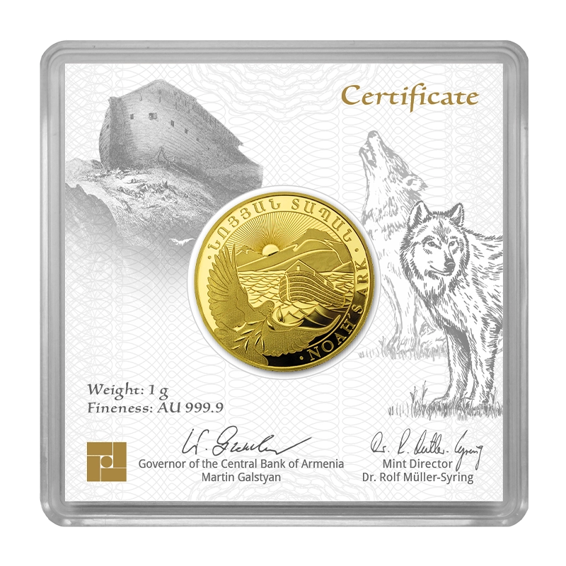 Die Edelmetallmünzen Arche Noah werden von der Zentralbank der Republik Armenien herausgegeben. Als gesetzliche Zahlungsmittel in Armenien unterliegt die Herstellung den strengen Auflagen der Zentralbank: Reinheit des Edelmetalls, Gewicht und Qualität der Prägung werden staatlich geprüft und garantiert. Die Gold-Anlagemünze wird aus reinstem Gold (999,9/1000) hergestellt.