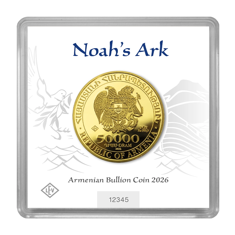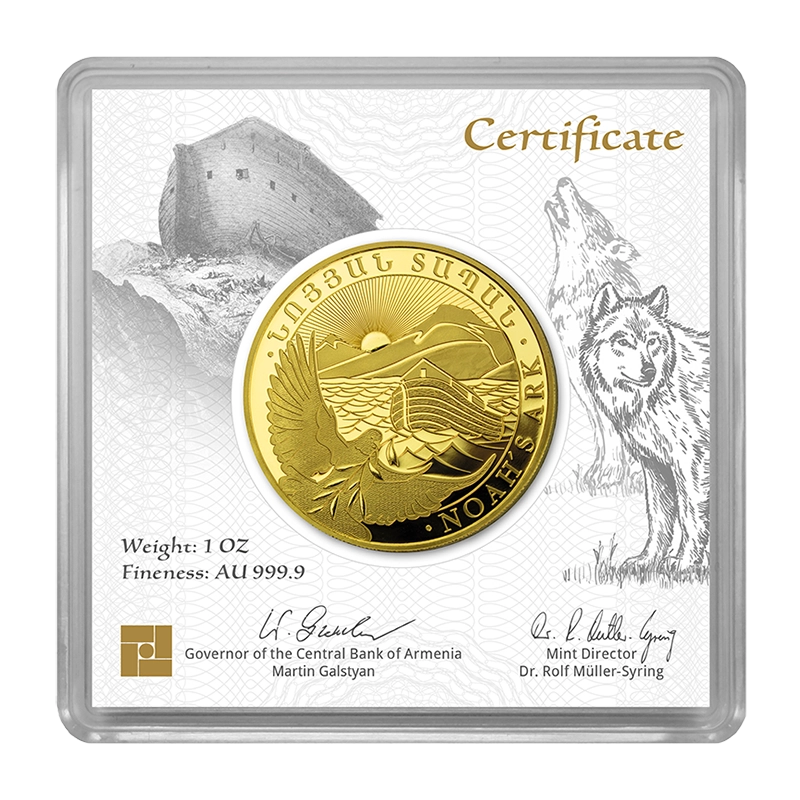 Die Edelmetallmünzen Arche Noah werden von der Zentralbank der Republik Armenien herausgegeben. Als gesetzliche Zahlungsmittel in Armenien unterliegt die Herstellung den strengen Auflagen der Zentralbank: Reinheit des Edelmetalls, Gewicht und Qualität der Prägung werden staatlich geprüft und garantiert. Die Gold-Anlagemünze wird aus reinstem Gold (999,9/1000) hergestellt.