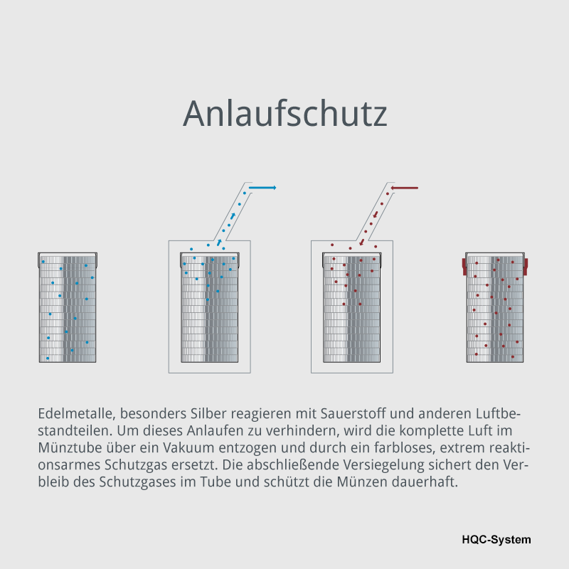 Die Besonderheit bei diesen Münzen ist das HQC-System, ein spezielles Verfahren, bei dem ein Schutzgas in die Tuben geleitet wird, welches die Münzen umhüllt und das Silber vor der Entstehung von Milchflecken bewahrt.