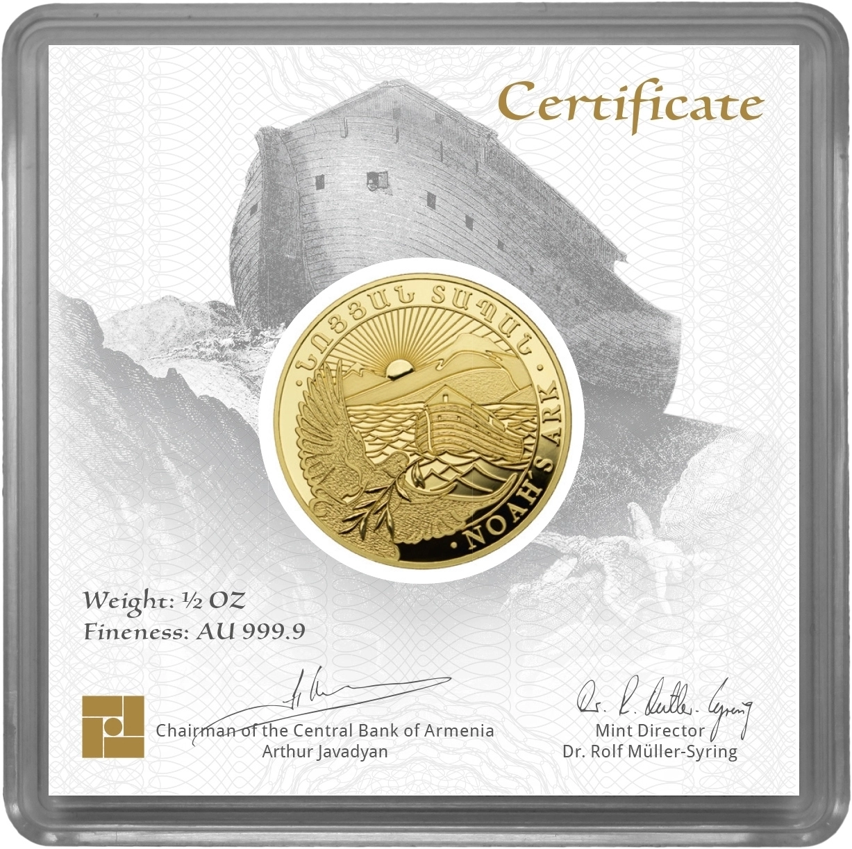 Die Edelmetallmünzen Arche Noah werden von der Zentralbank der Republik Armenien herausgegeben. Als gesetzliche Zahlungsmittel in Armenien unterliegt die Herstellung den strengen Auflagen der Zentralbank: Reinheit des Edelmetalls, Gewicht und Qualität der Prägung werden staatlich geprüft und garantiert. Die Gold-Anlagemünze wird aus reinstem Gold (999,9/1000) hergestellt.
