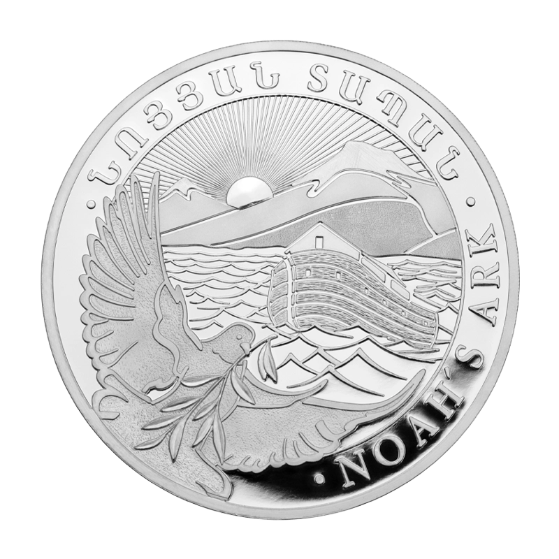 Die Silbermünze des Staates Armenien besitzt in jeder Hinsicht eine geschichtsträchtige Prägung auf der Motivseite. Auf dieser ist das aus biblischen Zeiten bekannte Schiff Arche Noah und der aufgehenden Sonne mit dem Berg Ararat im Hintergrund zu sehen. Der Berg Ararat, ein ruhender Vulkan, liegt an der Grenze zu Armenien und der Türkei.
