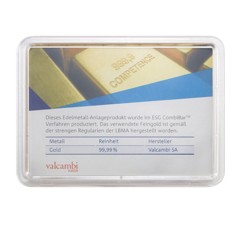 Der 50g Combi Barren besteht aus reinem Feingold (999,9/1000). Seine spezielle Prägung mit Sollbruchstellen erlaubt es, dass man einzelne 1g Barren abtrennen kann. Im Gegensatz zu einem normalen 50g Goldbarren, den Sie nicht zerteilen können, bietet Ihnen der Combibarren, oder auch Tafelbarren genannt, die nötige Flexibilität, bei einem Wiederverkauf. Sie erhalten mit diesem Produkt die Möglichkeit 50 x 1 Gramm Gold in einem Verbund und somit preisgünstiger zu erwerben. Jeder einzelne Goldbarren in diesem Verband ist mit einer auszeichnenden Prägung versehen und steht so beim vereinzeln der Barren für sich selbst. Auf jedem Minibarren finden Sie das Gewicht (1g), die Art des Edelmetalls, die Reinheit (999,9/1000) und den Hersteller. Dies bedeutet Gold kaufen in flexibelster Art und Weise. In der Regel handelt es sich um Goldbarren des Herstellers Valcambi, in Ausnahmefällen liefern wir ESG Barren, die aber auch durch Valcambi hergestellt sind. Die Lieferung der Barren erfolgt zum Schutz vor Beschädigung gekapselt, zusammen mit einer Anleitung.