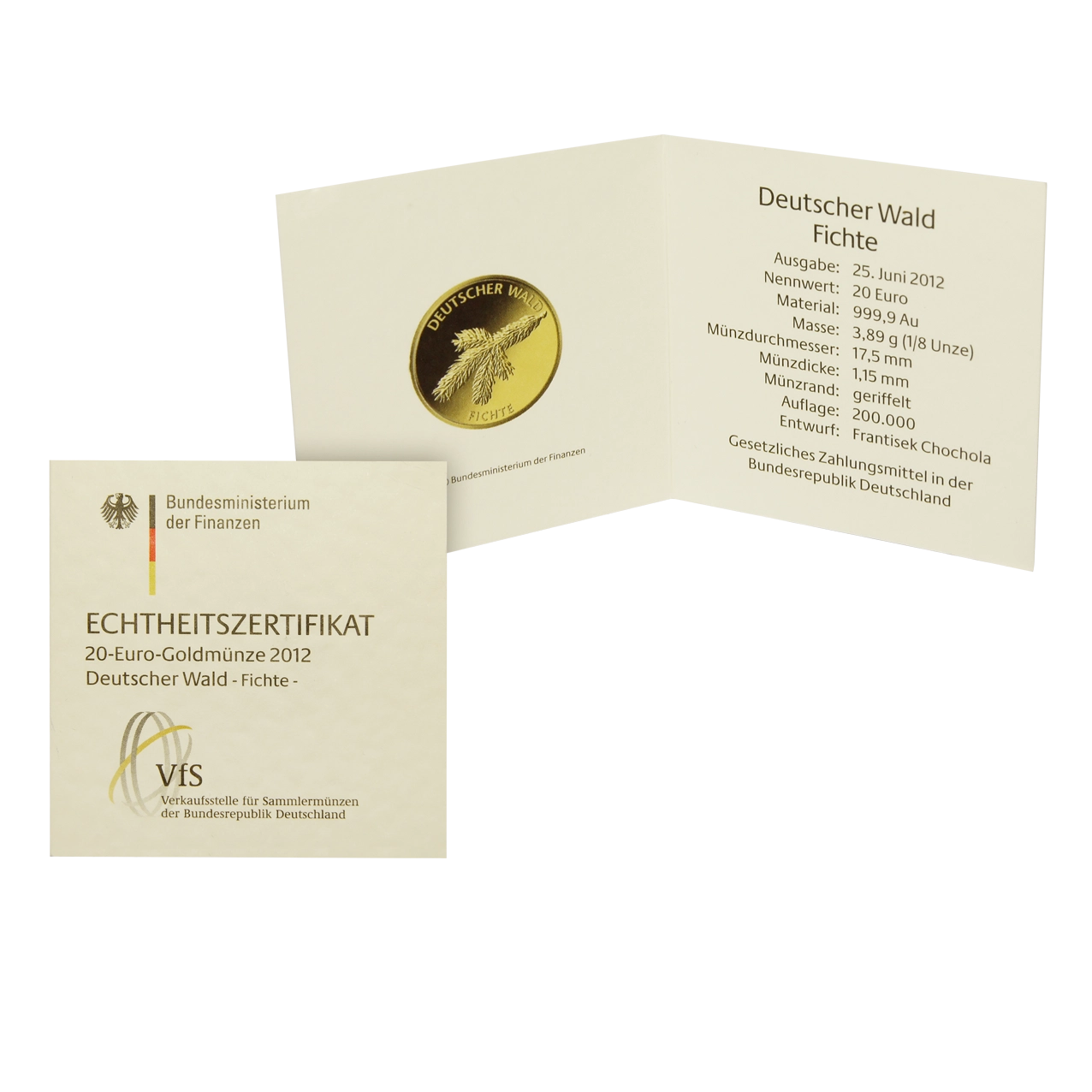 Hierbei handelt es sich um eine 1/8 oz Münze (entspricht einem Feingewicht von 3,8875 g) aus 999,9 Feingold. Der Nennwert dieser schönen Goldmünze beträgt 20 €. Das Münzmotiv der „Fichte“ 2012 zeigt eine Fichtenzweig mit dem Schriftzug „Deutscher Wald“ und „Fichte“.