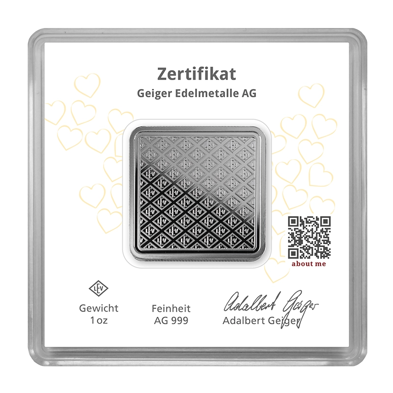 Beschreibung Druckbarren quadratisch - 1 oz Silber .999 zur Individualisierung - mit Zertifikat