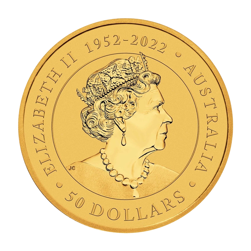 The investment product 1/2 oz gold Kangaroo / Nugget with a fineness of 999,9/1000 is a classic bullion coin and well known among experts of the precious metal sector. Any gold portfolio would benefit from this Australian gold coin, which is produced by the Perth Mint. Since the official start of the production in 1986 it has become more and more popular. It is an interesting product for investors as well as for collectors. Because of its high purity, high quality and its unique design it is nearly as famous as the Krugerrand. The best-known representative of Australia, the kangaroo, decorates the coin with a yearly changing portrait since 1990. Before the kangaroo was depicted, the obverse bore a gold nugget, and this is where its name comes from. As is custom with the Australian Perth Mint, the reverse of the coin bears the face of the British royal monarch with the corresponding nominal value of $50.