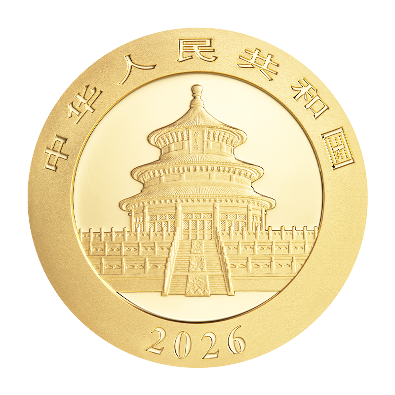 The gold Panda shows on its obverse side the consistent motif of the Temple of Heaven, where the Chinese Emperors of the Ming and Qing Dynasties prayed for a good harvest every year. On this side you also find the year of mintage and the name of the country "People's Republic of China" written with Chinese letters.