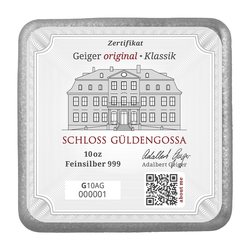 All bars are made of finest silver (999/1000) and show on the front the Geiger Edelmetalle lettering with the famous castle Güldengossa.