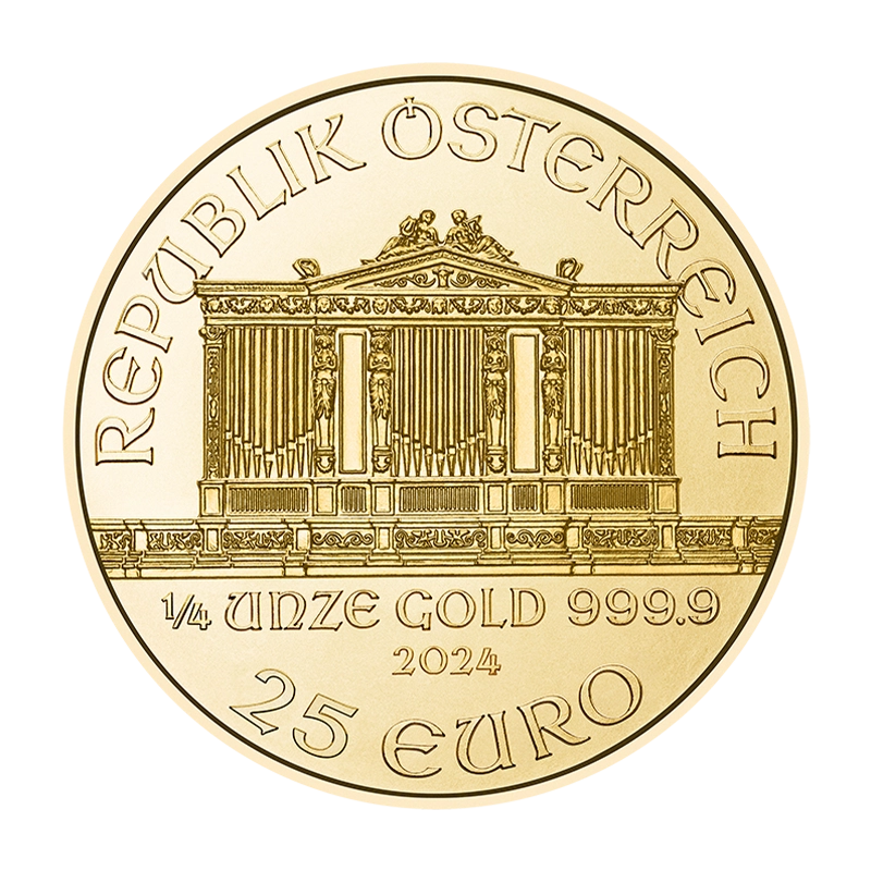 The Vienna Philharmonic owes its name to the famous Austrian orchestra, which is one of the best in the world. The gold coin shows the large organ of the Vienna Musikverein on the obverse. Below the organ, the weight of 1/4 oz, the fineness 999.9, the year of mintage and the face value of 25 EURO are embossed. Above you can see the embossed lettering "REPUPLIK ÖSTERREICH". On the reverse side, some musical instruments of the Philharmonic Orchestra are depicted and on the top edge, you can see the name of the orchestra and the gold coin, "WIENER PHILHAMRONIKER". Similar to the gold bullion coins above, the Vienna Philharmonic is also available in 1 oz, 1/2oz and 1/10oz sizes.
