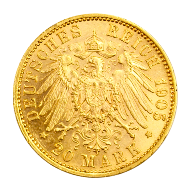 Nach der Vereinigung der deutschen Staaten zum deutschen Kaiserreich, folgte die Einführung einer gemeinschaftlichen Währung, der Mark. Jeder deutsche Staat erhielt das Prägerecht für die Goldmark. Die Wertseite der Münze zeigt, wie alle Reichsmarkmünzen den gekrönten Reichsadler. Außerdem finden Sie dort auch das Prägejahr, den Nennwert von 20 Mark und den Schriftzug „DEUTSCHES REICH“. Wie zur damaligen Zeit üblich hat die Münze eine Reinheit von 900/1000 und ein Feingewicht von 7,17 g. Durch die Reinheit bedingt, wiegt die Mark insgesamt 7,965 g.