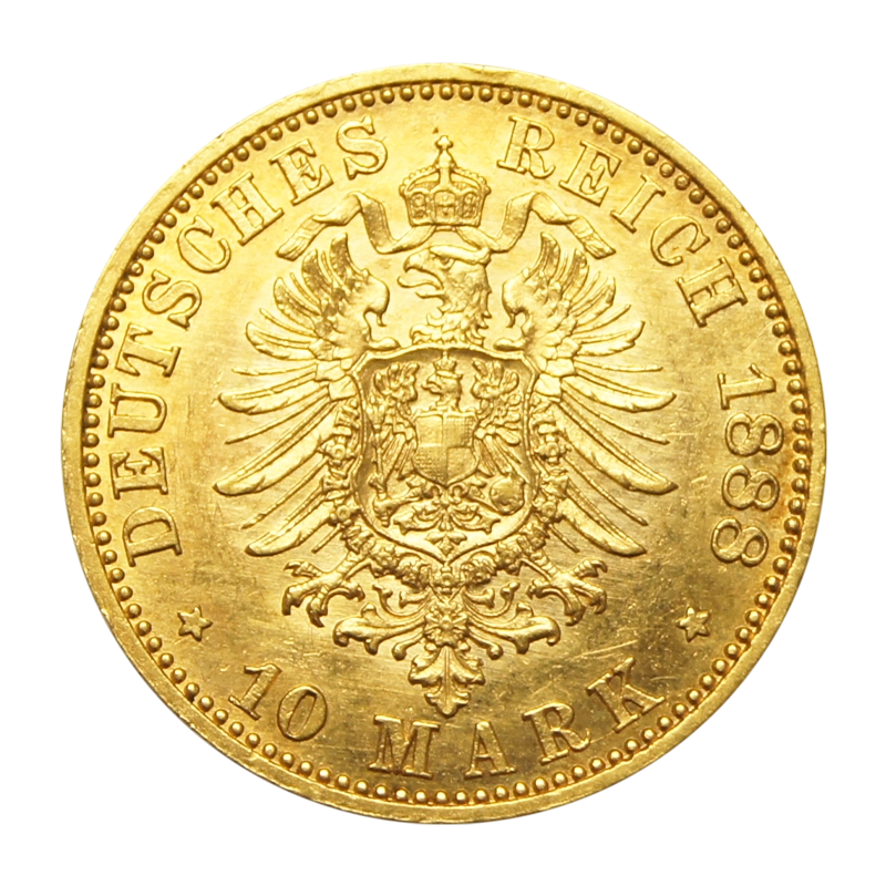 Die Rückseite zeigt ganz klassisch den gekrönten Reichsadler, die Inschrift "DEUTSCHES REICH", den Nennwert von 10 Mark und das Prägejahr 1888. Das Profil des deutschen Kaisers Friedrich III. prägt die Motivseite der Münze. Gold, als weiches Metall, ist nicht sehr praktikabel als Umlaufgeld, weshalb man eine Legierung verwendete. Die Feinheit der Münze beträgt aufgrund der Zugabe von Kupfer 900/1000, um die Münze alltagstauglicher zu machen. Durch diese Reinheit hat die Mark ein Feingewicht von 3,58 g und ein Gesamtgewicht von 3,98 g.