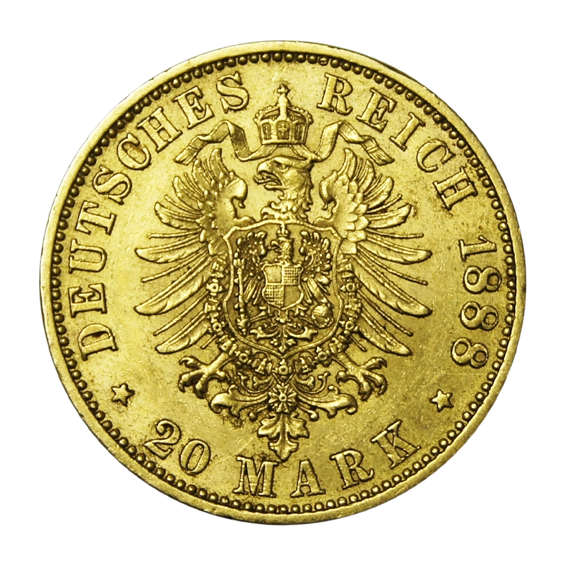 Die Rückseite zeigt ganz klassisch den gekrönten Reichsadler, die Inschrift "DEUTSCHES REICH", den Nennwert von 20 Mark und das Prägejahr 1988. Das Profil des deutschen Kaisers Friedrich III. prägt die Motivseite der Münze. Gold, als weiches Metall, ist nicht sehr praktikabel als Umlaufgeld, weshalb man eine Legierung verwendete. Die Feinheit der Münze beträgt aufgrund der Zugabe von Kupfer 900/1000, um die Münze alltagstauglicher zu machen. Durch diese Reinheit hat die Mark ein Feingewicht von 7,17 g und ein Gesamtgewicht von 7,965 g.