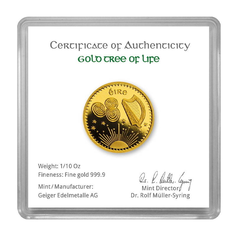 Die Kehrseite der Medaille zeigt die Abbildung des Baum des Lebens auf spirituelle Art. Der Baum steht in vielen Kulturen für Gleichgewicht, Fruchtbarkeit, Fülle, Stärke und Einheit. Der keltische oder gälische Baum ist als „Baum des Lebens“ im alten Irland bekannt.
