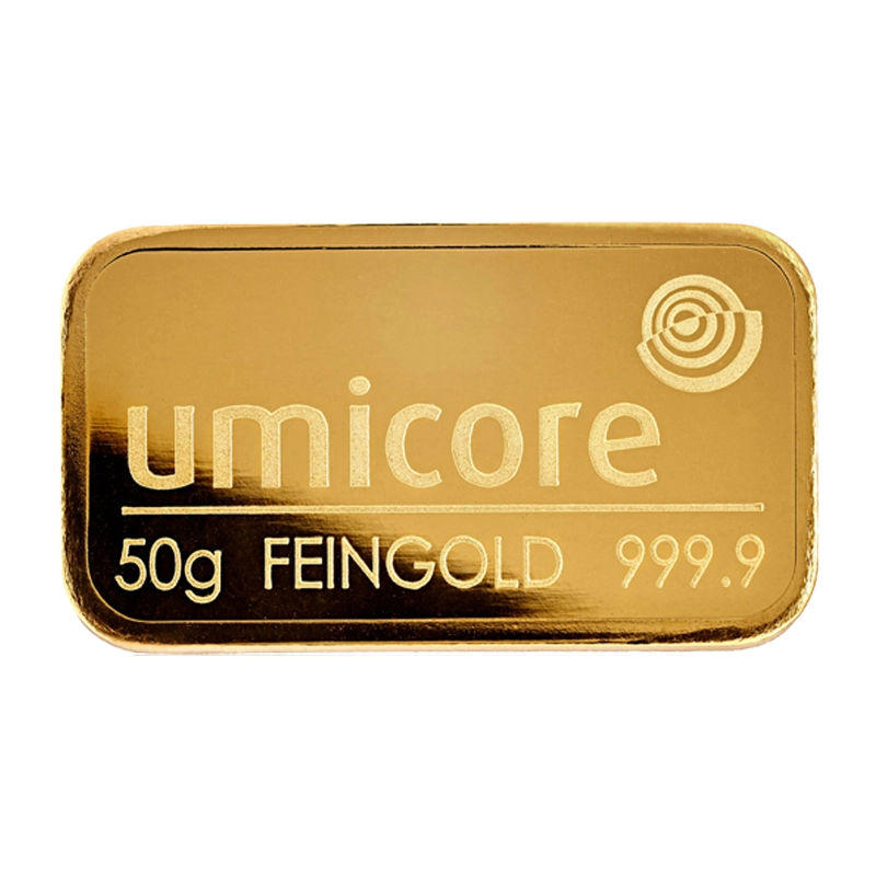 Goldbarren - 50 g .9999 - Umicore Neuware (geprägt)