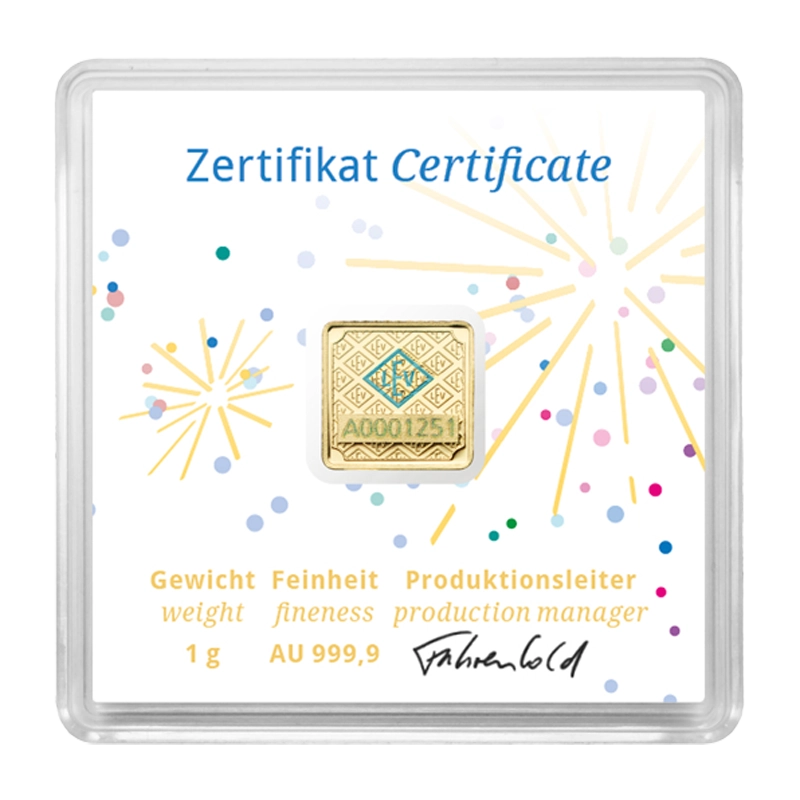 Goldbarren Geiger original - 1 g .9999 quadratisch in Kapsel Edition Feierliche Anlässe