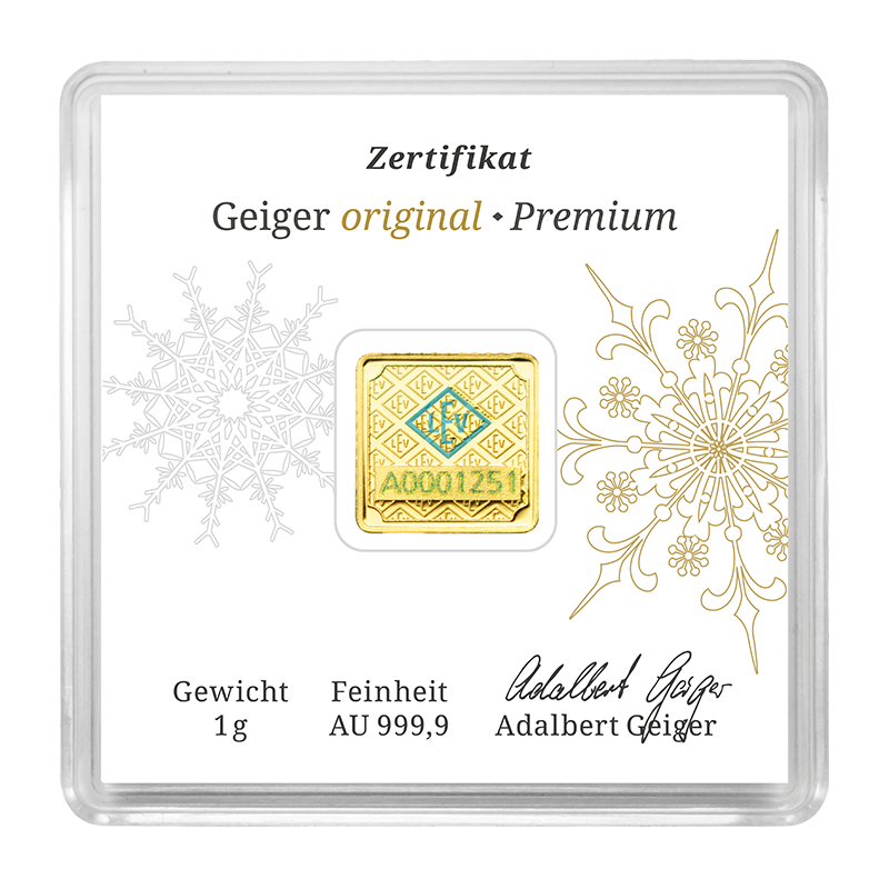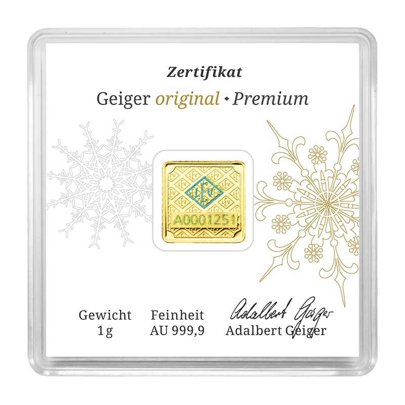 Goldbarren Geiger original - 1 g .9999 quadratisch in Kapsel Edition Weihnachten