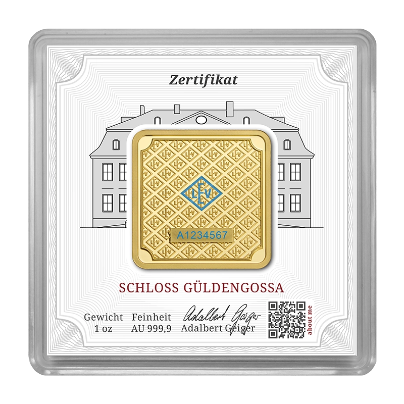 Die Vorderseite des Barrens trägt das bekannte Schloss Güldengossa, neben den Angaben zur Feinheit und Gewicht. Die Rückseite ziert das als Muster angeordnete Prägezeichen unserer Münzprägestätte, der Leipziger Edelmetallverarbeitung (kurz LEV). Außerdem befindet sich eine kolorierte Version des Prägezeichens in blau auf der Rückseite, welche unter UV-Beleuchtung fluoreszierend ist.