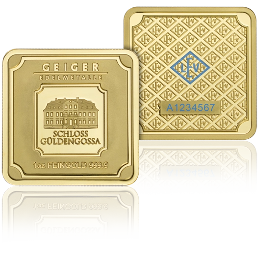 Die geprägte Vorderseite mit der sog. pearl-finish Oberfläche trägt das Geiger Edelmetalle Logo, sowie das Schloss Güldengossa und die Angaben zu Gewicht und Feinheit.