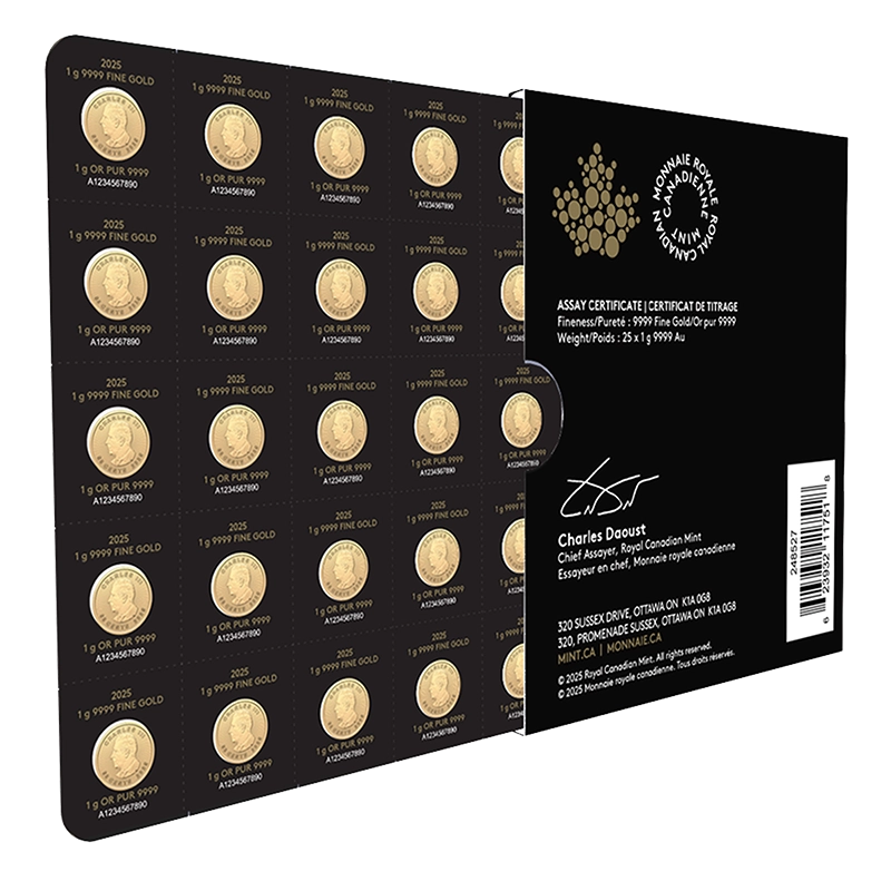 | Verpackung: | Die 25 Maple Leaf 1g Goldmünzen befinden sich in einer perforierten Blister Verpackung und sind dadurch problemlos teilbar.Die Schutzhülle ist nummeriert und dient als Echtheitszertifikat. |