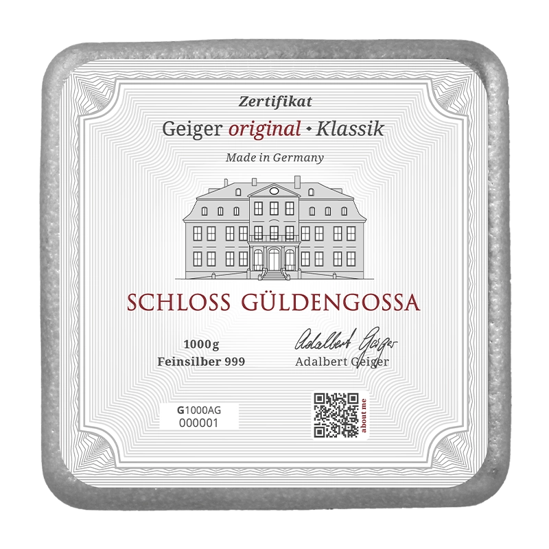 Alle Barren sind aus feinsten Silber (999/1000) hergestellt und zeigen auf der Vorderseite den Geiger Edelmetalle Schriftzug mit dem bekannten Schloss Güldengossa.