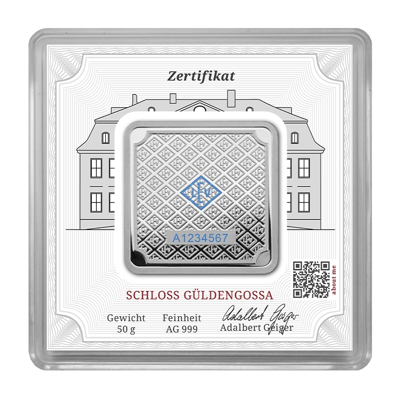 Dieser schöne Geiger original Silberbarren besteht aus 50 Gramm feinsten Silber 999 und wurde formvollendet mit ausgefeilten Sicherheitsmerkmalen versehen.