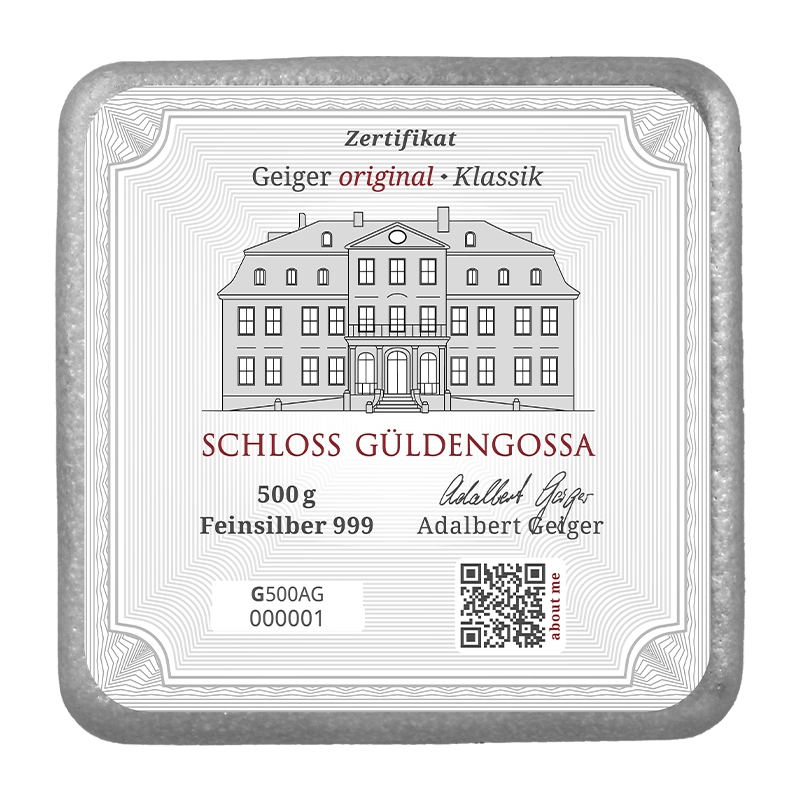 Alle Barren sind aus feinsten Silber (999/1000) hergestellt und zeigen auf der Vorderseite den Geiger Edelmetalle Schriftzug mit dem bekannten Schloss Güldengossa.