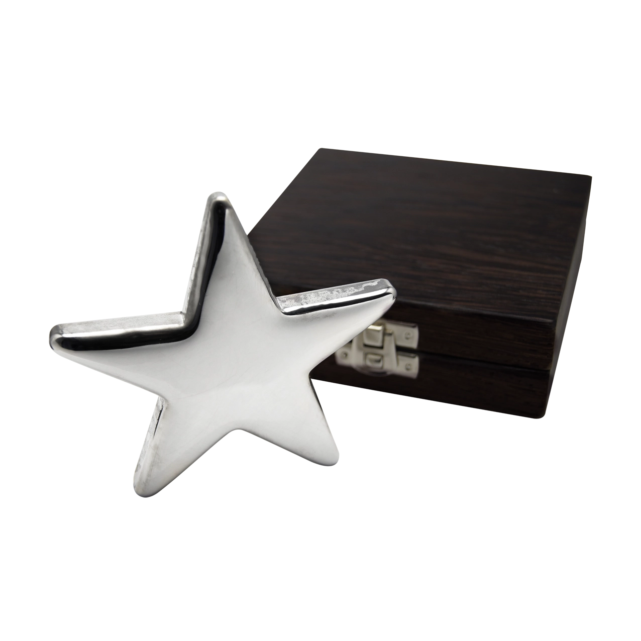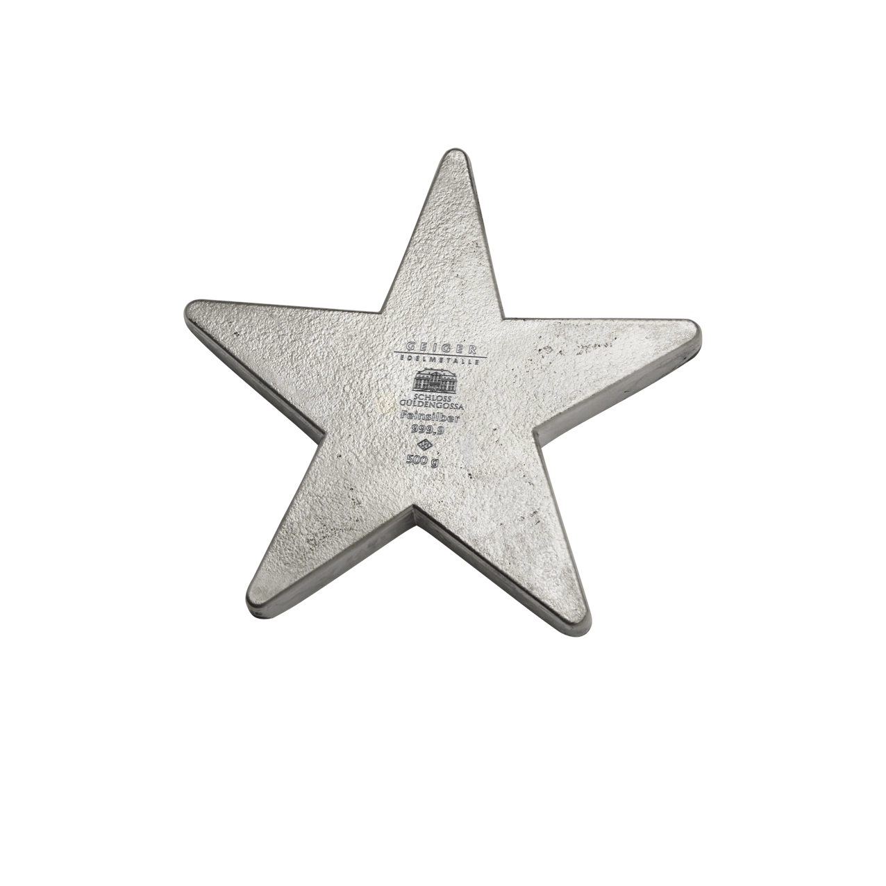 Eine schöne, hochwertige und außergewöhnliche Geschenkidee aus dem Hause Geiger: Gegossener Motivbarren aus Silber in der Feinheit 999/1000 in Form eines Sterns in gewohnter Geiger-Qualität, schutzlackiert und in einem edlen, im sächsischen Erzgebirge in Handarbeit gefertigten Holzetui verpackt. Durch den Schutzlack können Sie den hübschen Silberbarren bedenkenlos in die Hand nehmen und die Haptik genießen – das Einschweißen in eine störende Folie ist nicht mehr nötig. Dieser Barren ist außerdem in 500 g Feinkupfer erhältlich.