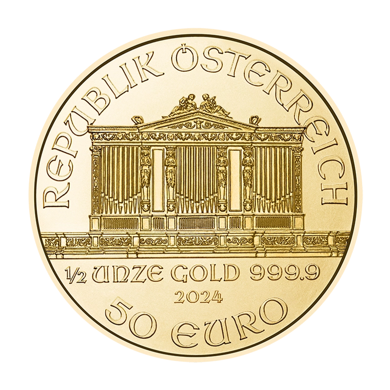 Seine rasch ansteigende Beliebtheit verdankt er vor allem dem Umstand, dass der Philharmoniker die erste europäische Goldmünze mit einem Feingehalt von 999,9/1000 besitzt. Obwohl er auch außerhalb der Europäischen Union eine große Fangemeinde hat ist er durch seinen Nennwert von 50 EURO besonders bei europäischen Anlegern gefragt. Doch diesen Wert trägt der „Wiener“ erst seit der Euroeinführung 2002, denn zuvor trug er einen Nennwert in Höhe von 1000 Schilling. Auch die Nähe der Prägestätte ist ein Plus für den Philharmoniker. Die kurzen Transportwege und die Tatsache, dass die Münze Österreich auch eine eigene Scheideanstalt unterhält, sorgen für ausreichende und schnelle Lieferungen. Der Wiener Philharmoniker verdankt seinen Namen dem bekannten österreichischen Orchester, welches zu den Besten der Welt zählt. Die Goldmünze zeigt auf der Vorderseite die große Orgel des Wiener Musikvereins. Unterhalb der Orgel sind das Gewicht von 1/2oz, die Feinheit 999,9, das Prägejahr und der Nennwert in Höhe von 50 EURO eingeprägt. Darüber können Sie den eingeprägten Schriftzug „REPUPLIK ÖSTERREICH“ erkennen. Auf der Rückseite sind einige Musikinstrumente der Philharmoniker abgebildet und am oberen Rand befindet sich der Name des Orchesters und der Goldmünze, „WIENER PHILHAMRONIKER“.